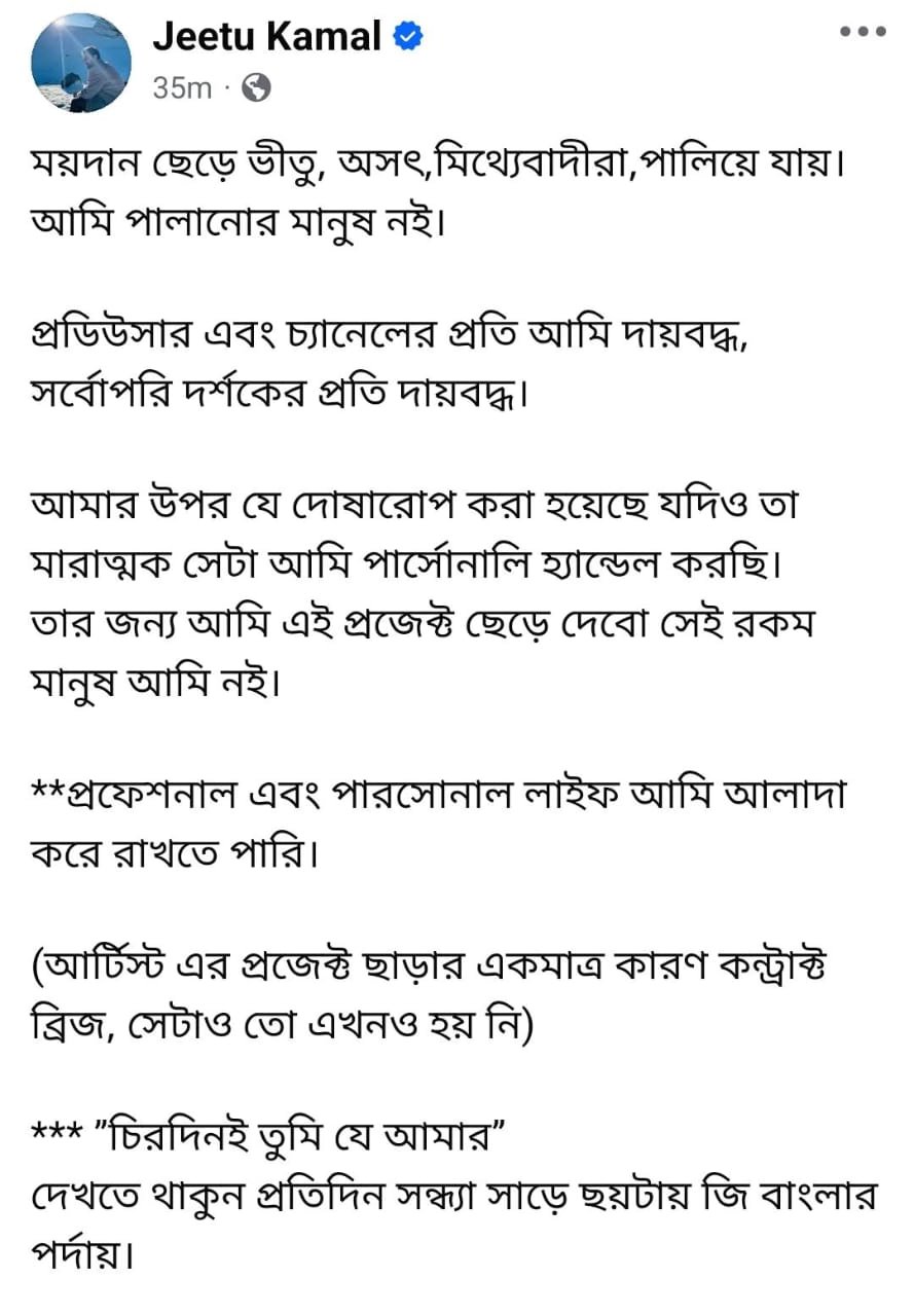 বিতর্ক আপাতত সঙ্গী। তবু ময়দান ছাড়বেন না। একটি পোস্টেই তা স্পষ্ট করে দিলেন 'চিরদিনই তুমি যে আমার'-এর আর্য থুড়ি জিতু কমল। দিতিপ্রিয়া রায়ের সঙ্গে তাঁর ব্যক্তিগত সমীকরনে ছেদ পড়লেও শুটিং ফ্লোরে পেশাদারিত্ব বজায় রাখতে চান ছোটপর্দার অন্যতম জনপ্রিয় নায়ক। শুক্রবার একটি ফেসবুক পোস্টে জিতু লেখেন, 'ময়দান ছেড়ে ভীতু, অসৎ,মিথ্যেবাদীরা,পালিয়ে যায়।আমি পালানোর মানুষ নই। প্রডিউসার এবং চ্যানেলের প্রতি আমি দায়বদ্ধ,সর্বোপরি দর্শকের প্রতি দায়বদ্ধ। আমার উপর যে দোষারোপ করা হয়েছে যদিও তা মারাত্মক সেটা আমি পার্সোনালি হ্যান্ডেল করছি। তার জন্য আমি এই প্রজেক্ট ছেড়ে দেবো সেই রকম মানুষ আমি নই। **প্রফেশনাল এবং পারসোনাল লাইফ আমি আলাদা করে রাখতে পারি। (আর্টিস্ট এর প্রজেক্ট ছাড়ার একমাত্র কারণ কন্ট্রাক্ট ব্রিজ, সেটাও তো এখনও হয় নি) "চিরদিনই তুমি যে আমার” দেখতে থাকুন প্রতিদিন সন্ধ্যা সাড়ে ছয়টায় জি বাংলার পর্দায়।' (পোস্টের বানান অপরিবর্তিত রাখা হল)