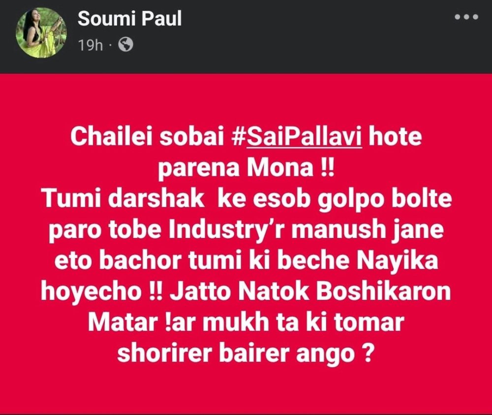 ব্যাস! শ্বেতার এই মন্তব্যেই যেন রেগে আগুন সৌমি। সমাজমাধ্যমে নাম না করেই একের পর এক বিস্ফোরক পোস্টের মাধ্যমে শ্বেতাকে একহাত নিয়েছেন তিনি। বৃহস্পতিবার সৌমি প্রথমে একটি পোস্ট করে লেখেন, "চাইলেই সবাই সাই পল্লবী হতে পারে না মনা! তুমি দর্শককে এসব গল্প বলতে পারো, তবে ইন্ডাস্ট্রির মানুষ জানে এত বছর তুমি কী বেচে নায়িকা হয়েছ! যত্ত নাটক বশীকরণ মাতার। মুখটা কি তোমার শরীরের বাইরের অঙ্গ?"