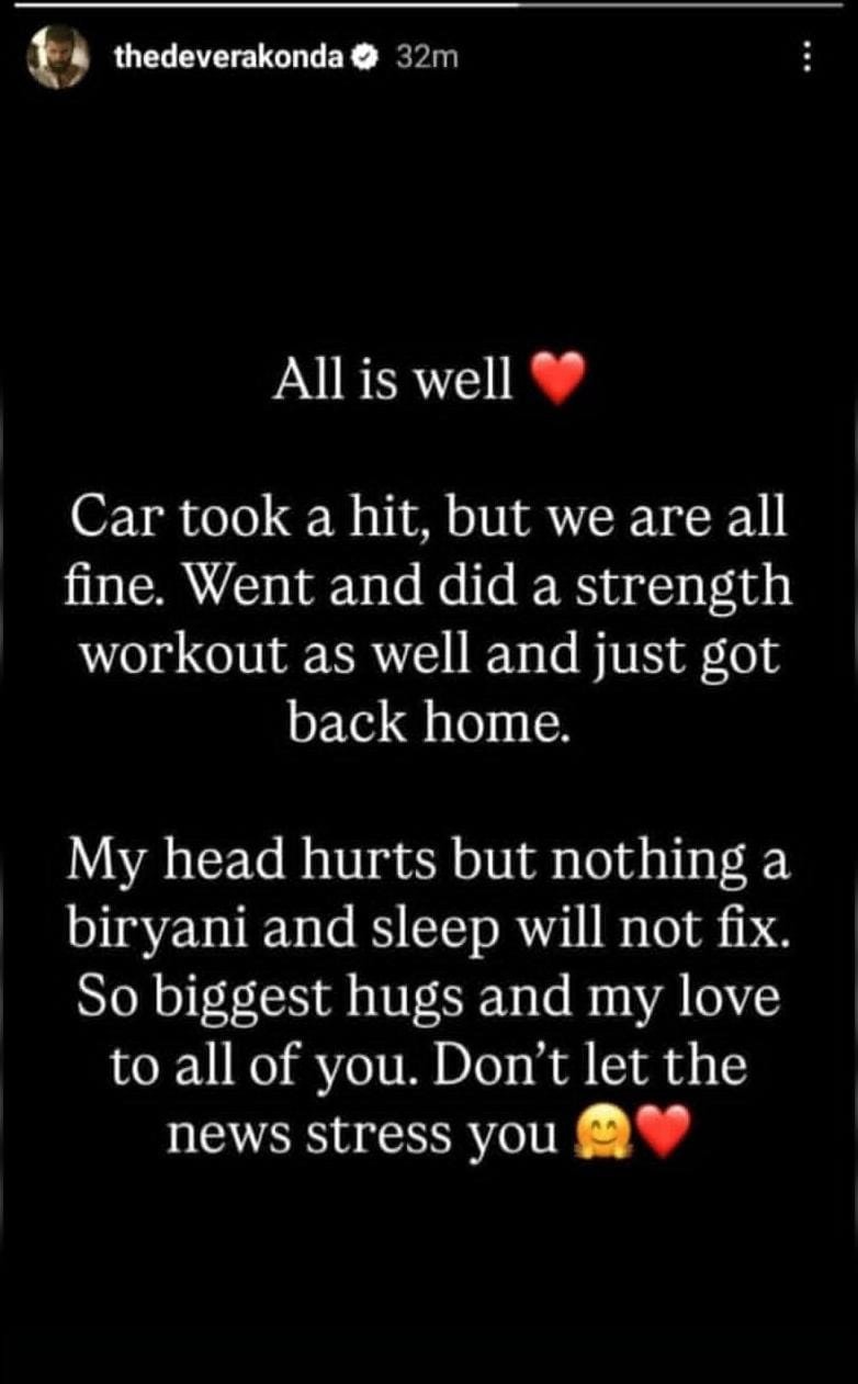 ঘটনাস্থলে উপস্থিত থাকা সত্ত্বেও সৌভাগ্যবশত বিজয় দেবেরকোন্ডা অক্ষত আছেন। গাড়িতে তিনি ছাড়াও আরও দু'জন ছিলেন এবং তাঁরাও সুরক্ষিত। পুলিশের মতে, আকস্মিক মোড় নেওয়ার কারণেই এই সংঘর্ষ হয় এবং বিজয়ের গাড়িতে সামান্য ক্ষতি হয়েছে। দুর্ঘটনার পরপরই অভিনেতা অন্য একটি গাড়িতে করে গন্তব্যের দিকে রওনা হন এবং তাঁর টিম ইন্স্যুরেন্সের জন্য পুলিশের কাছে অভিযোগ দায়ের করে।