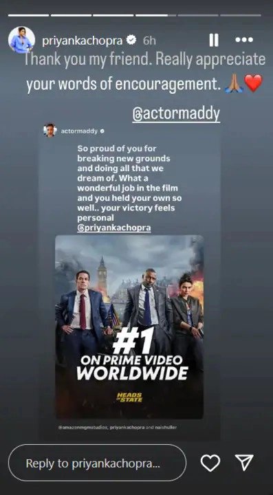 অভিনেতার কথায়, “কী দারুণ অভিনয়! তুমি একেবারে নিজের জায়গাটা তৈরি করেছ।” এই প্রশংসার জবাবে প্রিয়াঙ্কাও ইনস্টাগ্রাম স্টোরিতে মাধবনের পোস্ট শেয়ার করে লেখেন, “ধন্যবাদ বন্ধু… তোমার উৎসাহভরা কথাগুলো সত্যিই অনেকটা মানে রাখে।” সঙ্গে জুড়লেন একটি নমস্কার ভঙ্গির হাত আর লাল হৃদয়ের ইমোজি।'হেডস অফ স্টেট' ছবিতে প্রিয়াঙ্কা হলেন এমআই ৬ (MI6) এজেন্ট নোয়েল বিসে। ছবিতে আমেরিকার প্রেসিডেন্ট হিসেবে জন সিনা এবং ব্রিটিশ প্রধানমন্ত্রী হিসেবে ইদ্রিস এলবা—এই দুই চরিত্রের জুটি, বিশ্ববিপর্যয় থামাতে মরিয়া। পরিচালক ইলিয়া নাইশুলার। আবেগময় এই আন্তরিক মুহূর্তে বলিউড আর হলিউড যেন একসুতোয় বাঁধা পড়েছে।