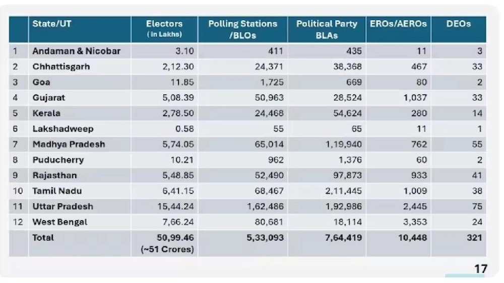 বিহারে ইতিমধ্যেই চূড়ান্ত ভোটার তালিকা প্রকাশ হয়ে গেছে। বিহার রাজ্যে সম্প্রতি ভোটার তালিকা যাচাইয়ের কাজ শেষ হয়েছে। সেখানে ৩০ সেপ্টেম্বর পর্যন্ত প্রকাশিত চূড়ান্ত তালিকায় প্রায় ৭ কোটি ৪২ লক্ষ নাম অন্তর্ভুক্ত হয়েছে। রাজ্যটি দুই দফায় ভোট দেবে — ৬ ও ১১ নভেম্বর, ভোটগণনা হবে ১৪ নভেম্বর। স্থানীয় নির্বাচনের কারণে কিছু রাজ্যে দেরিতে করা হবে বলে জানা যাচ্ছে। পিটিআই সূত্রে আরও জানা গেছে, যেসব রাজ্যে স্থানীয় সংস্থার নির্বাচন বর্তমানে চলছে বা শীঘ্রই অনুষ্ঠিত হতে চলেছে, সেসব রাজ্যে এই সংশোধন প্রক্রিয়া আপাতত পিছিয়ে দেওয়া হবে। কারণ স্থানীয় নির্বাচনের কাজে প্রশাসনিক যন্ত্রপাতি ইতিমধ্যেই ব্যস্ত রয়েছে।